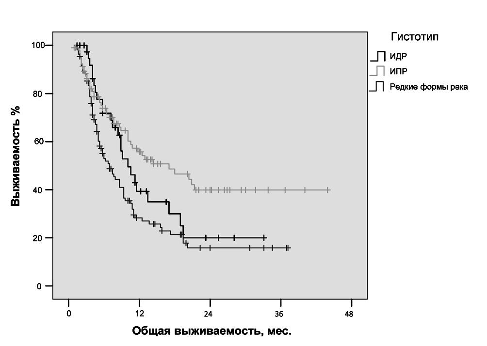 В проведенном исследовании средняя ОВ со# ставила 31,6±2,1 мес. с медианой 24±1,7 мес. Правильная постановка стадии заболевания име# ет принципиальное значение для прогноза ОИФ РМЖ. В частности, ОВ у пациенток с T4N0#3M0 (n=30) составила 29±1,6 мес. с медианой 27±1,3 мес., тогда как у пациенток с T4N0#3M1 (n=18) — только 14,1±0,8 мес. с медианой 12,3±0,3 мес. (р=0,001) (рис. 1.).