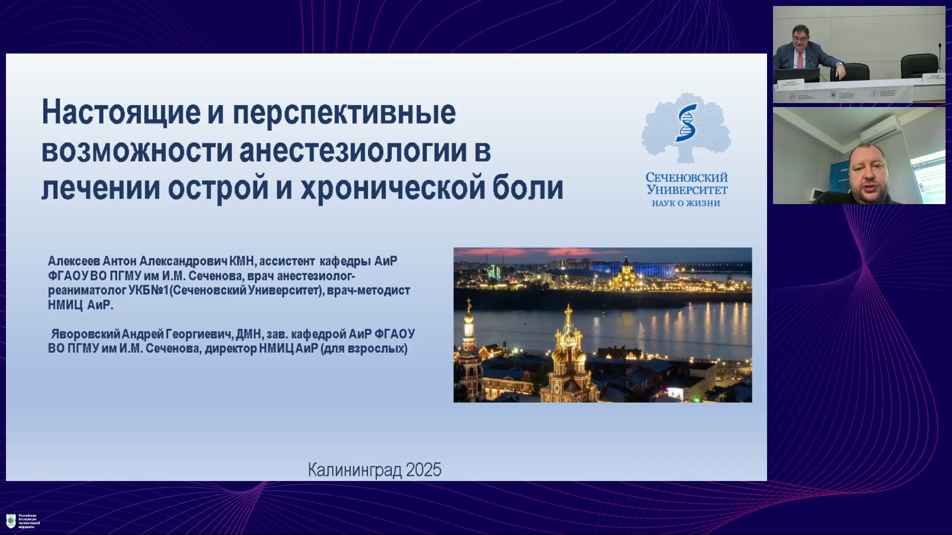 Настоящие и перспективные возможности анестезиологии в лечении острой и хронической боли - Яворовский Андрей Георгиевич д.м.н, заведующий кафедрой АиР ФГАОУ ВО ПГМУ им Сеченова И.М., директор НМИЦ АиР им Н.В. Склифосовского (для взрослых); Алексеев Антон Александрович к.м.н., ассистент кафедры АиР ФГАОУ ВО ПГМУ им Сеченова И.М., врач-методист НМИЦ АиР им Н.В. Склифосовского (для взрослых), врач-анестезиолог-реаниматолог УКБ№1 (Сеченовский университет). г. Москва. (онлайн. модератор Новиков Г.А)